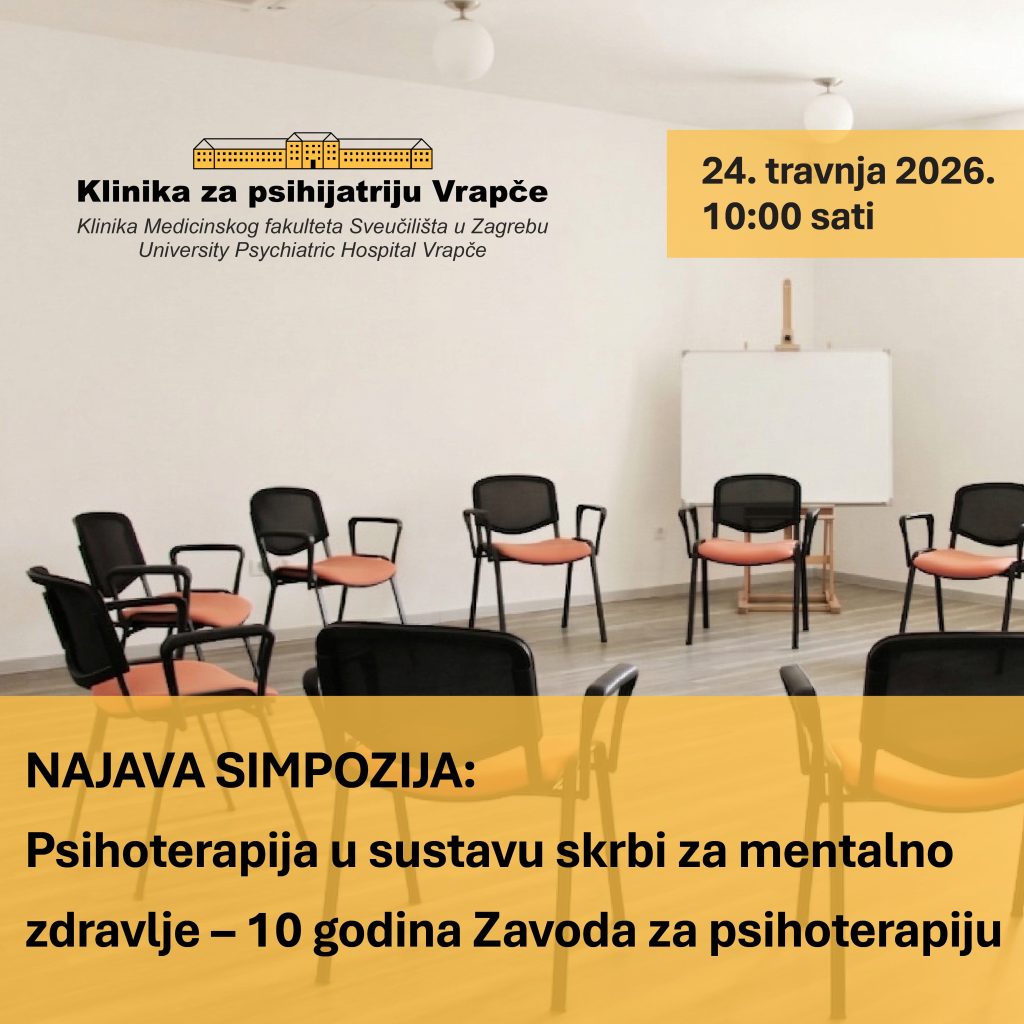 S osobitim zadovoljstvom najavljujemo simpozij „Psihoterapija u sustavu skrbi za mentalno zdravlje – 10 godina Zavoda za psihoterapiju Klinike za psihijatriju Vrapče“, koji će se održati 24. travnja 2026. godine s početkom u 10:00 sati u Edukacijskom centru Klinike za psihijatriju Vrapče.